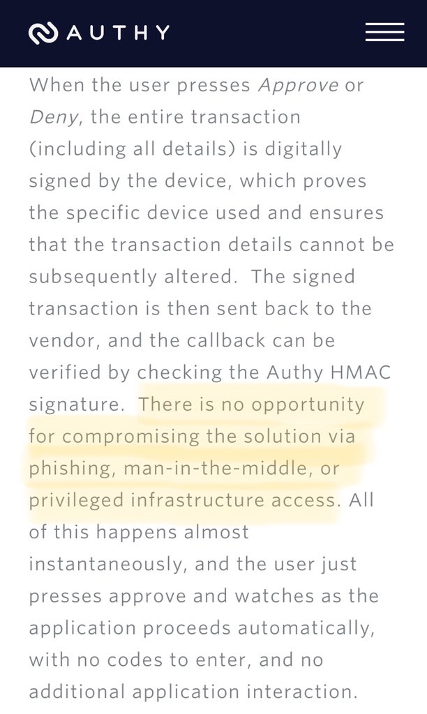 Phishing is tough (I get that). Notwithstanding the correct way to tackle it, re: your “OTP/PUSH” statement - below describes Authy’s PUSH implementation. Maybe the context only refers to securing the PUSH itself (opposed to the end to end session)? I will need to check.pic.twitter.com/fYszizxpox