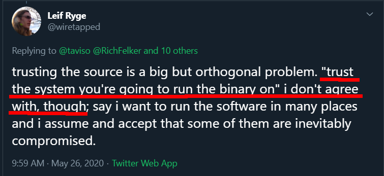 You said "[i dont agree with] trust the system you're going to run the binary on", and now you're saying "you need to trust the system you *run* the software on". Can you see why I might find that frustrating?pic.twitter.com/ETgiLxe0Wx