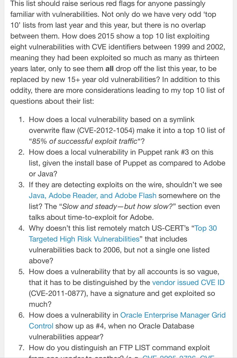 I'm a VZ DBIR fan, but @attritionorg raises impt questions about the vuln data. Solid answers could help everyone!https://blog.osvdb.org/2016/04/27/a-note-on-the-verizon-dbir-2016-vulnerabilities-claims/ …