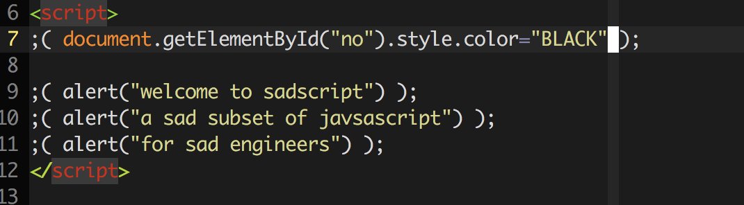 ;( alert("welcome to sadscript") ); ;( alert("a sad javascript syntax") ); ;( alert("for sad programmers") );pic.twitter.com/lEqW6eQFwH