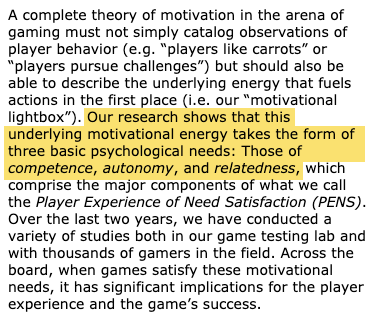 Do great games model a meaningful life? In the PENS game design framework, a truly engaging game satisfies three core needs: competence, autonomy, and relatedness. In psychology, Self-Determination Theory claims those same three needs are essential to a life worth living.pic.twitter.com/F8vggEgsHT