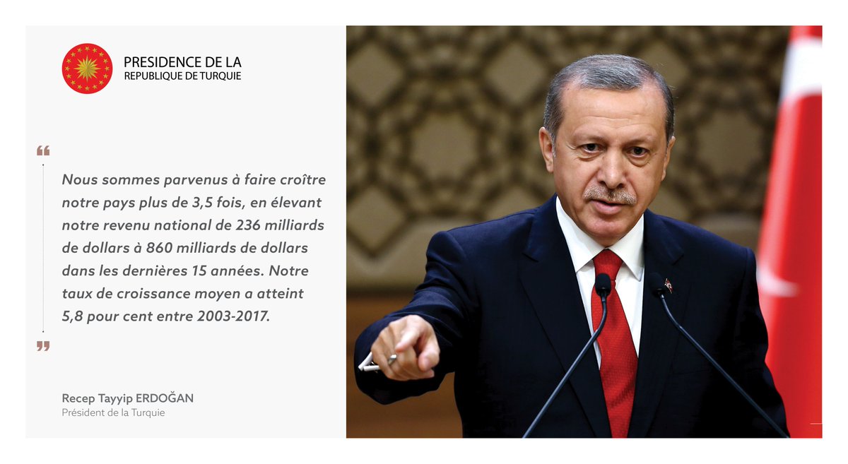 Président Erdoğan: "Nous sommes parvenus à faire croître notre pays plus de 3,5 fois, en élevant notre revenu national de 236 milliards de dollars à 860 milliards de dollars dans les dernières 15 années. Notre taux de croissance moyen a atteint 5,8 pour cent entre 2003-2017."pic.twitter.com/wFdDhHqz3i