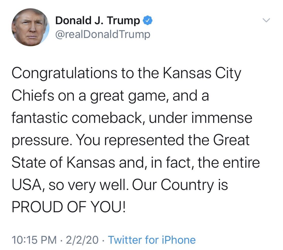 @realDonaldTrump decided to move Arrowhead Stadium to Kansas!Hvala. Twitter će to iskoristiti za poboljšanje vaše vremenske crte. PoništiPoništi