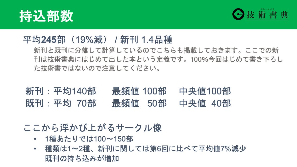 #技術書典 7でのサークルごとの頒布部数は、 ・紙面の頒布平均:133部 ・電子の頒布平均:48部 でした。詳しくは「技術書典7サークル参加アンケート結果と分析」をご覧ください。 https://blog.techbookfest.org/2019/11/29/tbf07-report/ …pic.twitter.com/hIuwWtZ5Hc