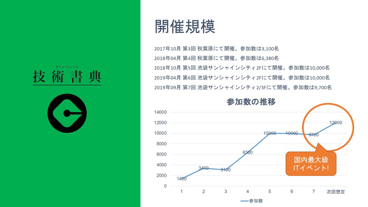 国内最大規模のエンジニア向けイベント、「技術のお祭り」こと技術書典を、スポンサーという形で応援くださる協賛企業を募集しております。詳しくは「ご協賛資料」をご覧ください。