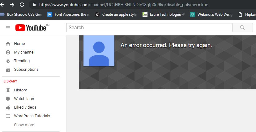 I can't access my youtube channel --> customize channel section, if already reported more times, but still, @YouTube doesn't care about my youtube channel. https://www.youtube.com/channel/UCaHBHiBNFNDIrG8qIp0d9kg?disable_polymer=true … channel link, @TeamYouTube give me the proper solution.pic.twitter.com/hYLv8UZZPX