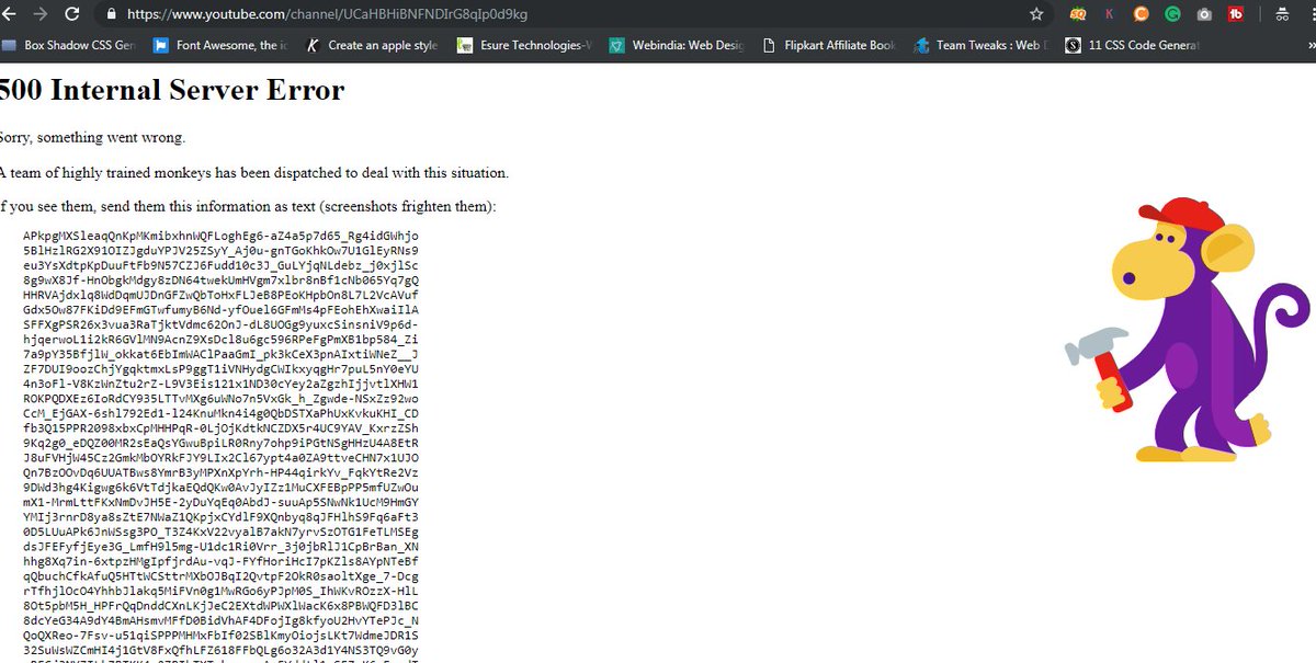 i try everything but still i face the same issue. @TeamYouTube uninstall the app and try , clear the cookies and everything but once login with my mail , i cant use customize channel and mychannel , sometimes its shows 500 server eror with monkey image