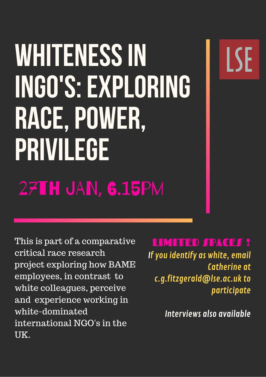 If you identify as white, and work for an INGO in the UK, and think about issues of race, power and privilege - have a think about participating in the discussion below with LSE.https://twitter.com/FitzCatherine/status/1218181470696755200 …
