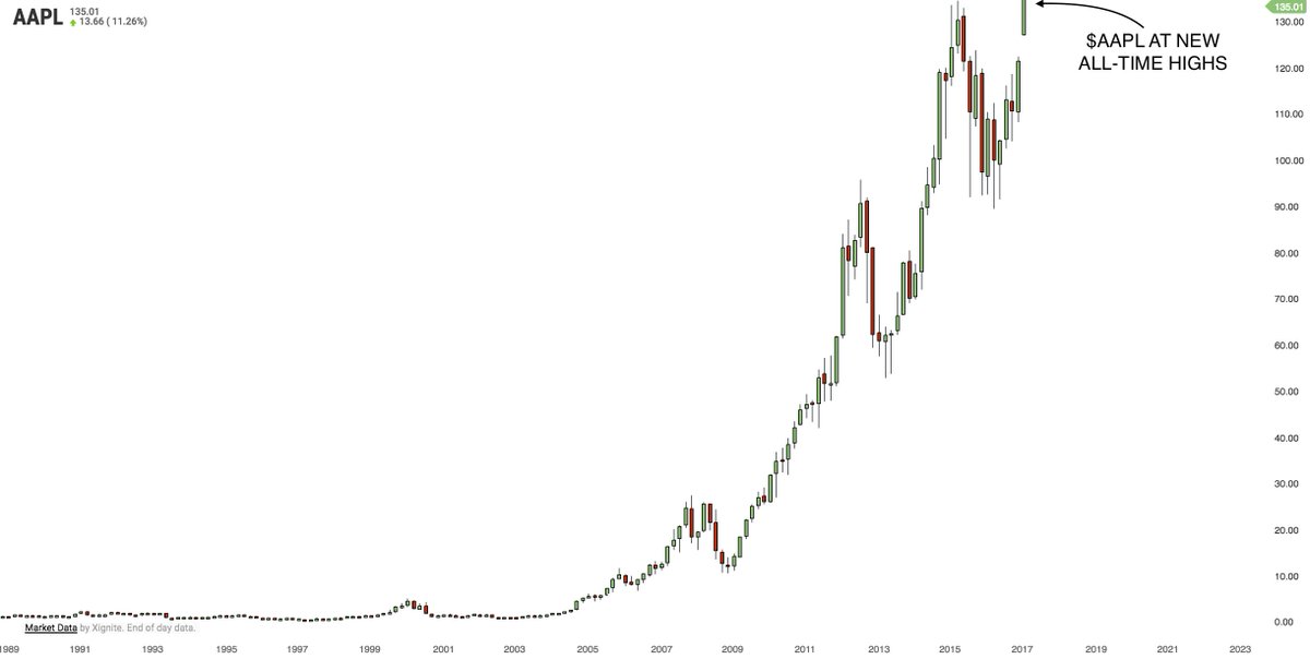 Apple hit a new all-time high today at $135.09 per share. That means its market cap is now $715 BILLION.