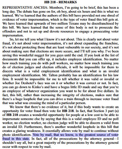 "One last thing on voting by mail. This time, from Democrat Rafael Anchia back in 2007: