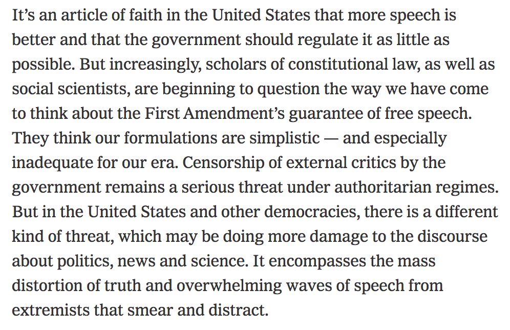 It's not a freedom of speech issue. Illegally hacked or manipulated materials need to be controlled. Further, every conservative newspaper would not allow articles of a certain nature based on their values. What's wrong with that?