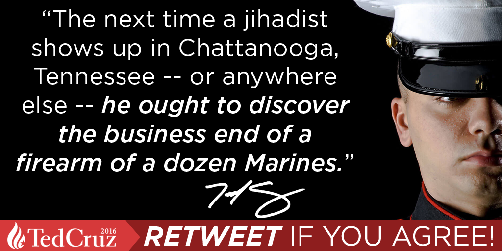@tedcruz The day after the shootings a Navy recruiter brought in his personal weapon and shot himself in the leg in Georgia. Great idea! -