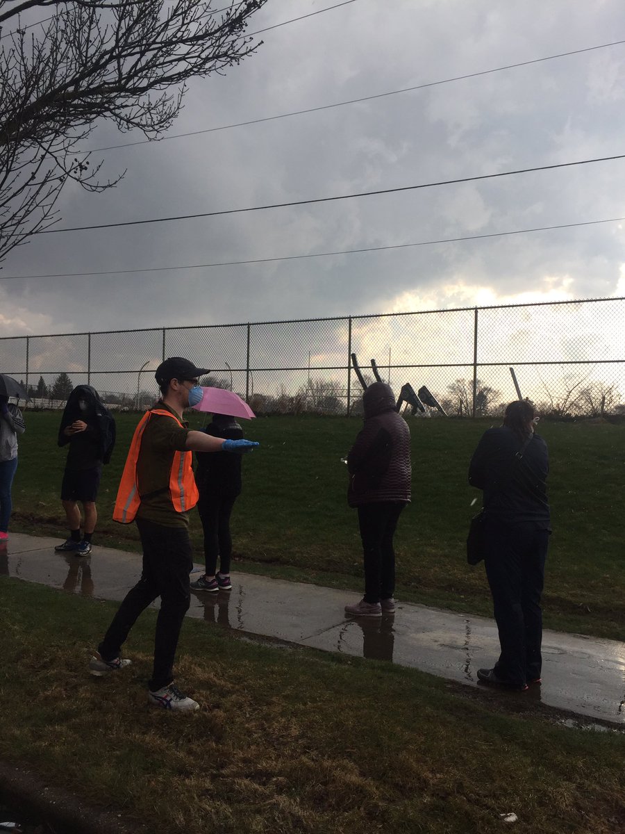 A poll worker reminding people to stay 6ft apart. (You can’t tell from this photo, but it down-poured and people are soaked. The line is slightly shorter as a result, but many people are still sticking it out.)pic.twitter.com/uHZdM3skYC