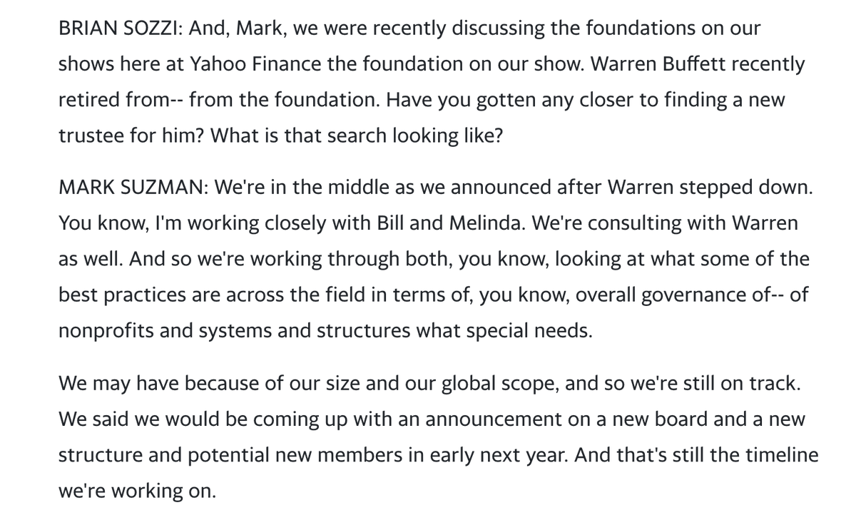 @GatesFoundation after the changes this summer.@MSuzman talked to@BrianSozzi & said that Gates will "certainly" add more than one person but that the foundation board is unlikely to ever be 12 to 15 people. https://finance.yahoo.com/video/yahoo-finance-presents-mark-suzman-110000784.html …pic.twitter.com/CiOmgfvpr0