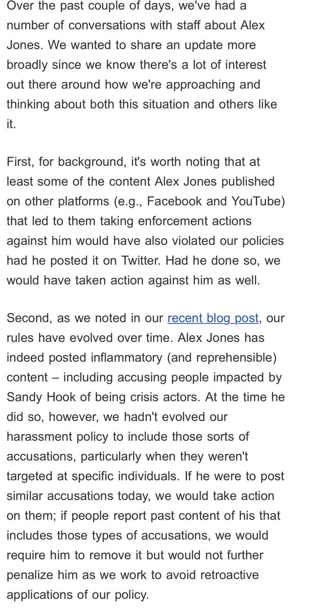 Twitter has a choice. They can act with Facebook, YouTube and Apple and ALSO ban Alex Jones. Or they can do nothing. Which will devastate all the work Twitter has done to combat hate speech on their platform. The world is watching,