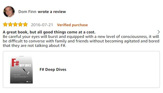 @CleverFinn anything for this#fsharp Deep Dives review: https://www.amazon.co.uk/gp/customer-reviews/R1XVPBPFSJY64/ref=cm_cr_dp_d_rvw_ttl?ie=UTF8&ASIN=1617291323 … I hope we didn't cause family issues!pic.twitter.com/WcDTJtn5lw