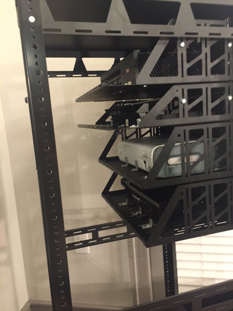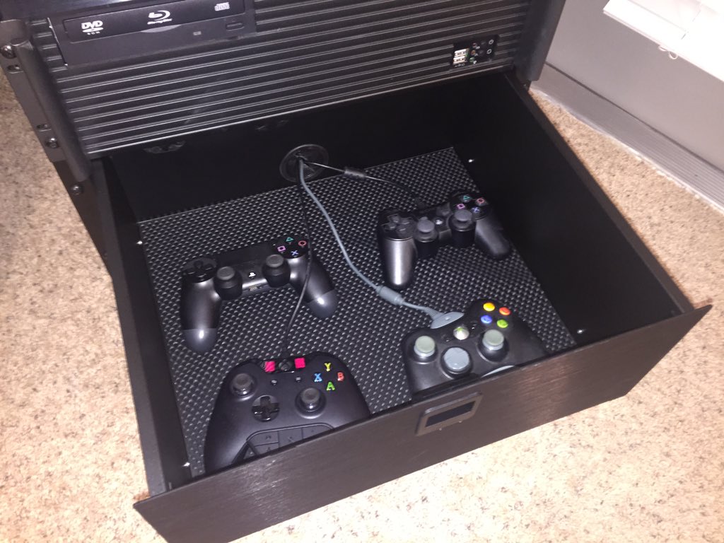 Rackmount Xbox One, PS4, Xbox 360, PS3, with 4U drawer for controllers and charging. Next is Denon 3808CI and HTPCpic.twitter.com/UQ91lsYEda