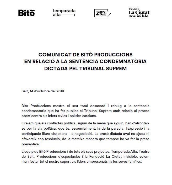 Des de Bitò, mostrem el nostre total desacord i rebuig a la sentència condemnatòria que ha fet pública el Tribunal Suprem. Hem emès el següent comunicat