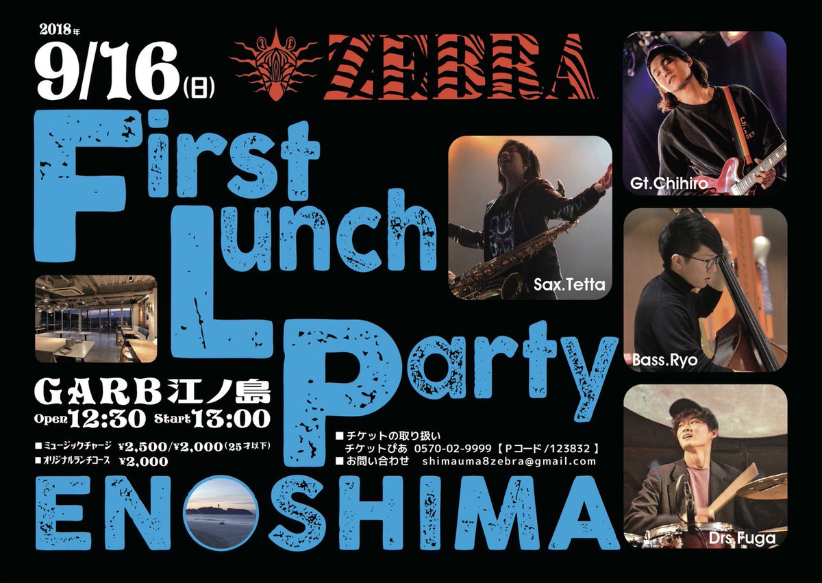 #zebra_lunch】 結成記念ランチライブパーティ‼︎ ○9/16(日)12:30open/13:00start ○Garb江ノ島 ○Ticket¥2,000(別途入場時にミュージックチャージ¥2,000〜) 夏の終わりに江ノ島と海の見えるレストランでライブパーティ、チケットご購入はチケットぴあ(https://t.pia.jp/pia/event/event.do?eventCd=1834079 …)pic.twitter.com/yy0vUinfhf