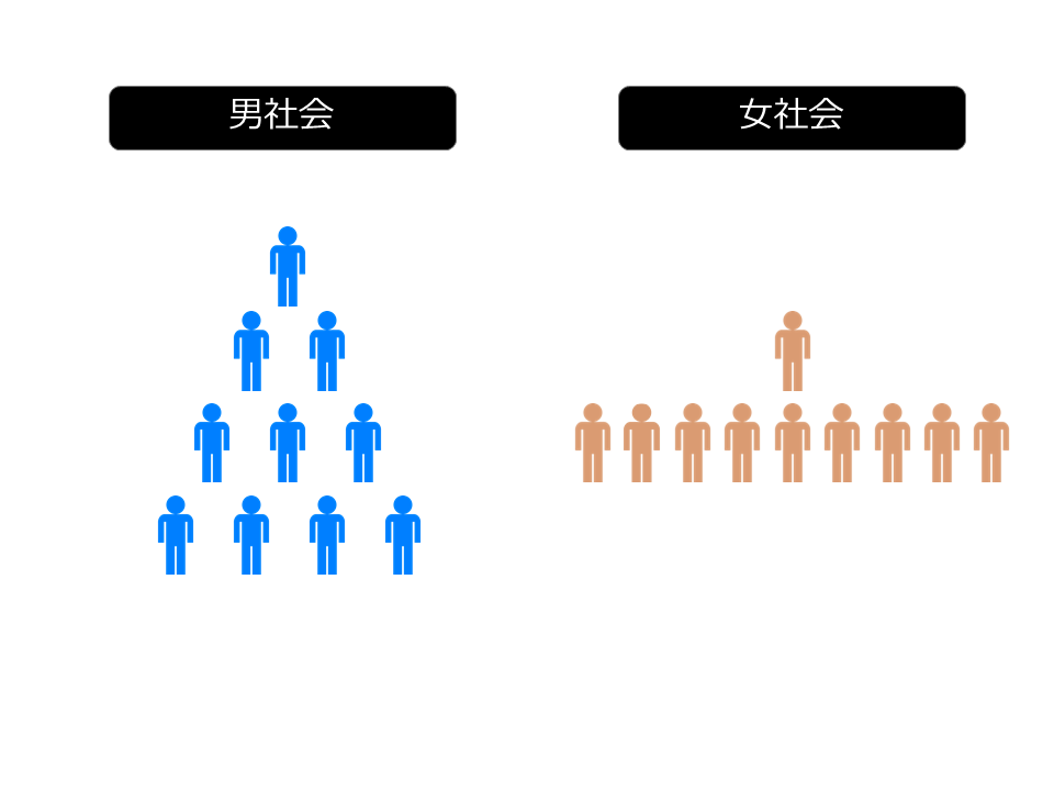 男社会はピラミッド型で女社会は鍋蓋型だというお話が前にありましたが、そこにフェミニズムが作用するとこんな感じになるというイメージpic.twitter.com/zUd088Jxyz