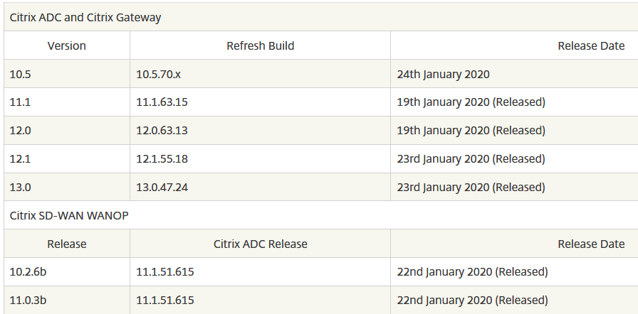 Citrix released another series of permanent CVE-2019-19781 fixes for Citrix ADC (NetScaler ADC) and Citrix Gateway versions 12.1 and 13.0. Available at: • https://www.citrix.com/downloads/citrix-adc/ … • https://www.citrix.com/downloads/citrix-gateway/ … 𝗢𝗻𝗹𝘆 𝘃𝗲𝗿𝘀𝗶𝗼𝗻 𝟭𝟬.𝟱 𝗹𝗲𝗳𝘁 𝘁𝗼 𝗽𝗮𝘁𝗰𝗵.pic.twitter.com/uuW0Ohre7Q