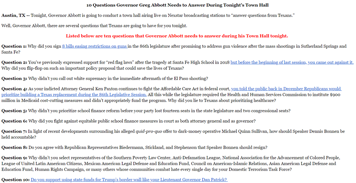 10 Questions Governor Greg Abbott Needs to Answer During Tonight’s Town Hallpic.twitter.com/LTF9pwIbWc