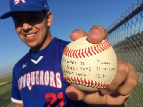 Los Altos senior Sam Gomez threw a perfect game with 13 strikeouts in a 12-0 win over Diamond Ranch. What a performance. He's 4-0 on the season.pic.twitter.com/aIFcMrSfSv