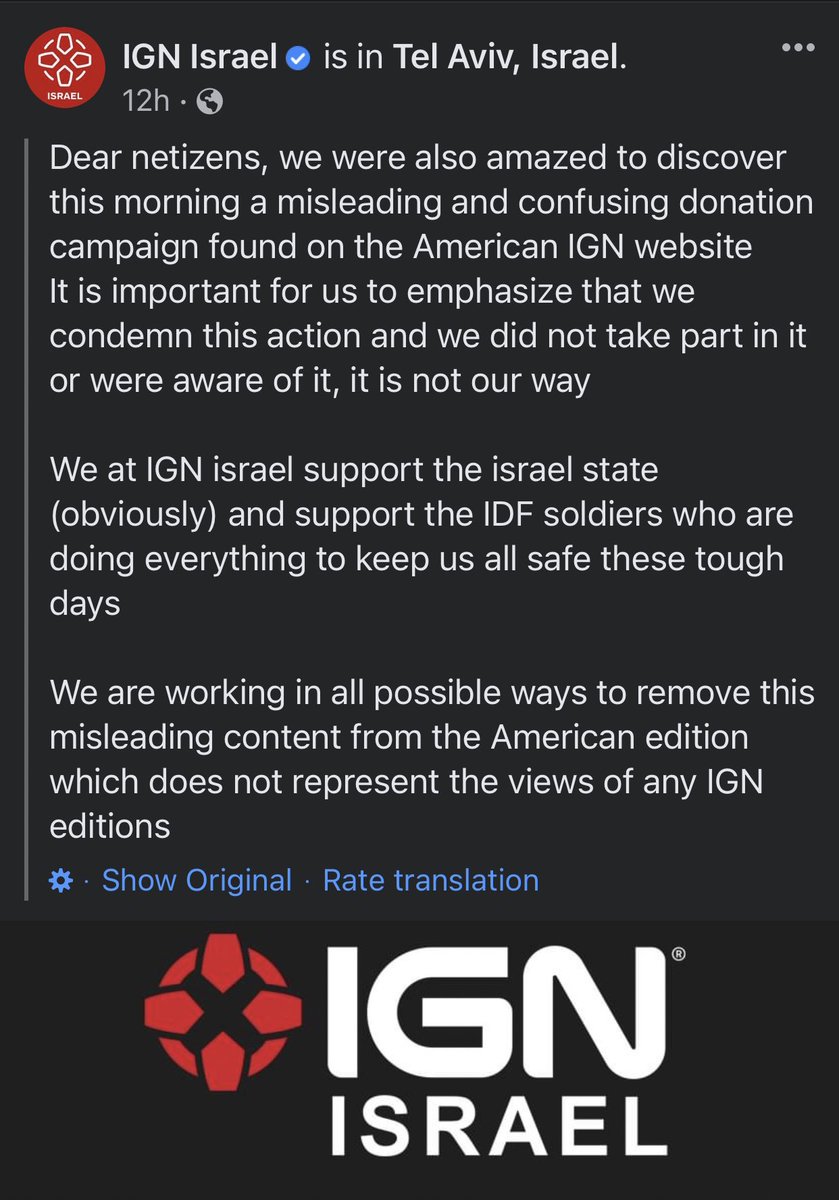 No, they are 100% saying that they do not agree with IGN's stance in protecting Palestinian children. To Israel, all Palestinians are enemies, including children. Members of their government have said it is their responsibility to kill Palestinian women and children.