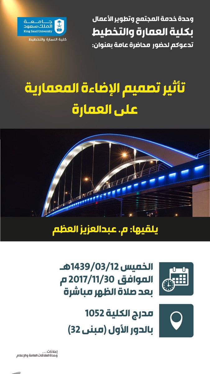 #كلية_العمارة_و_التخطيط ب#جامعة_الملك_سعود عن إقامة محاضرة عامة يلقيها المهندس عبدالعزيز العظم بعنوان "تأثير تصميم الإضاءة المعمارية على العمارة" يوم الخميس ١٤٣٩/٣/١٢ بعد صلاة الظهر مباشرة في مدرج الكلية ١٠٥٢pic.twitter.com/vKCDVLO4wk
