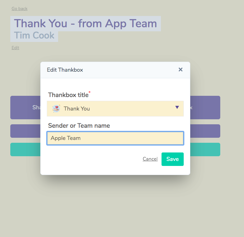 We've been working on improving the edit experience for a Thankbox. You can now very easily edit the title and Sender or team name