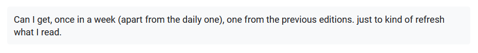 Yesterday, when I asked "What we could have done better with our The Great Engineering Newsletter?", we got this as one of the responses. """ Can I get, once in a week (apart from the daily one), one from the previous editions? just to kind of refresh what I read. """pic.twitter.com/4oynDA8sWy