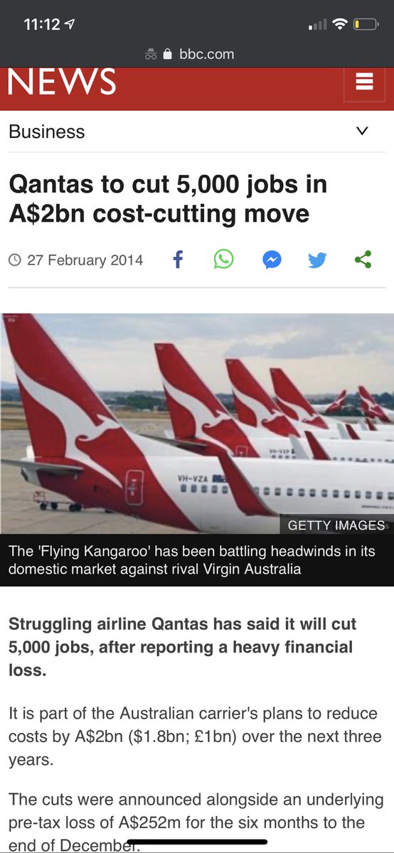Here in Aus Qantas laid off a large number of employees. Do you know what they did? Provided emergency accommodation to those in need at no cost and sought out alternative employment on behalf of the bulk of their employees with other large Australian businesses.