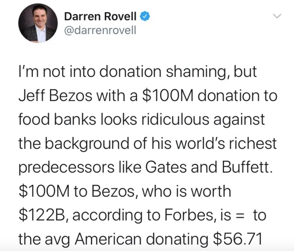 Darren Rovell Shames Jeff Bezos For Donating ONE HUNDRED MILLION DOLLARS To Food Banks https://www.barstoolsports.com/blog/2253674/darren-rovell-shames-jeff-bezos-for-donating-one-hundred-million-dollars-to-food-banks …pic.twitter.com/vpnujX2Wff
