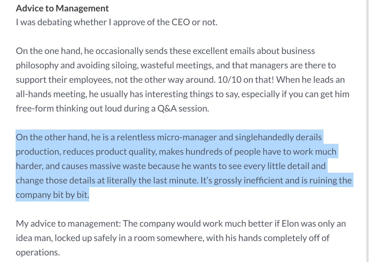 @elonmusk actions, and doesn't acknowledge the positives that can come from being micromanaged by a genius. Chalking up Elon's best features to great emails and philosophy doesn't add up...Thanks. Twitter will use this to make your timeline better. UndoUndo