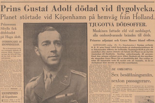 Den 26 januari 1947 omkom arvprins Gustaf Adolf i en flygolycka på Kastrup i Köpenhamn.