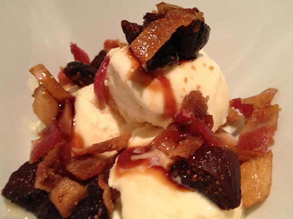 Last night: Mission figs & apples simmered in maple syrup brown sugar sauce, w/ candied bacon & vanilla ice cream. Yum!pic.twitter.com/Pb47XB4U