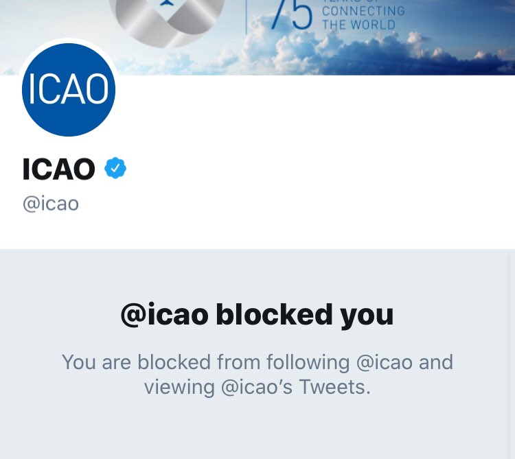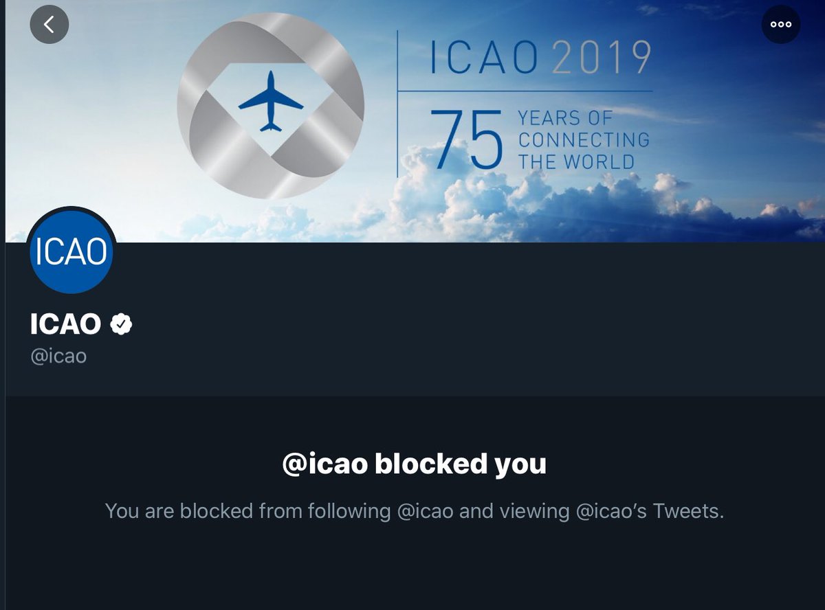 That didn’t take long. Does the thin-skinned, spineless @icao have a full time staffer dedicated to blocking people on Twitter? Or do they have 3 working on 24-7 shifts? 🤔pic.twitter.com/0RnCGWTZK6