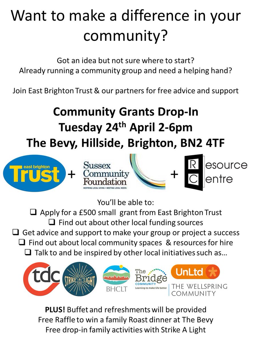 Please a) Share this post and b) put up a poster in your local community space. Join us on Tuesday 24th April 2-6pm at The Bevendean Cooperative Pub for FREE advice and support on how to start or grow your community projects. http://www.eastbrightontrust.org.uk/community-grants-drop-in.html …pic.twitter.com/kmeKRad8yW