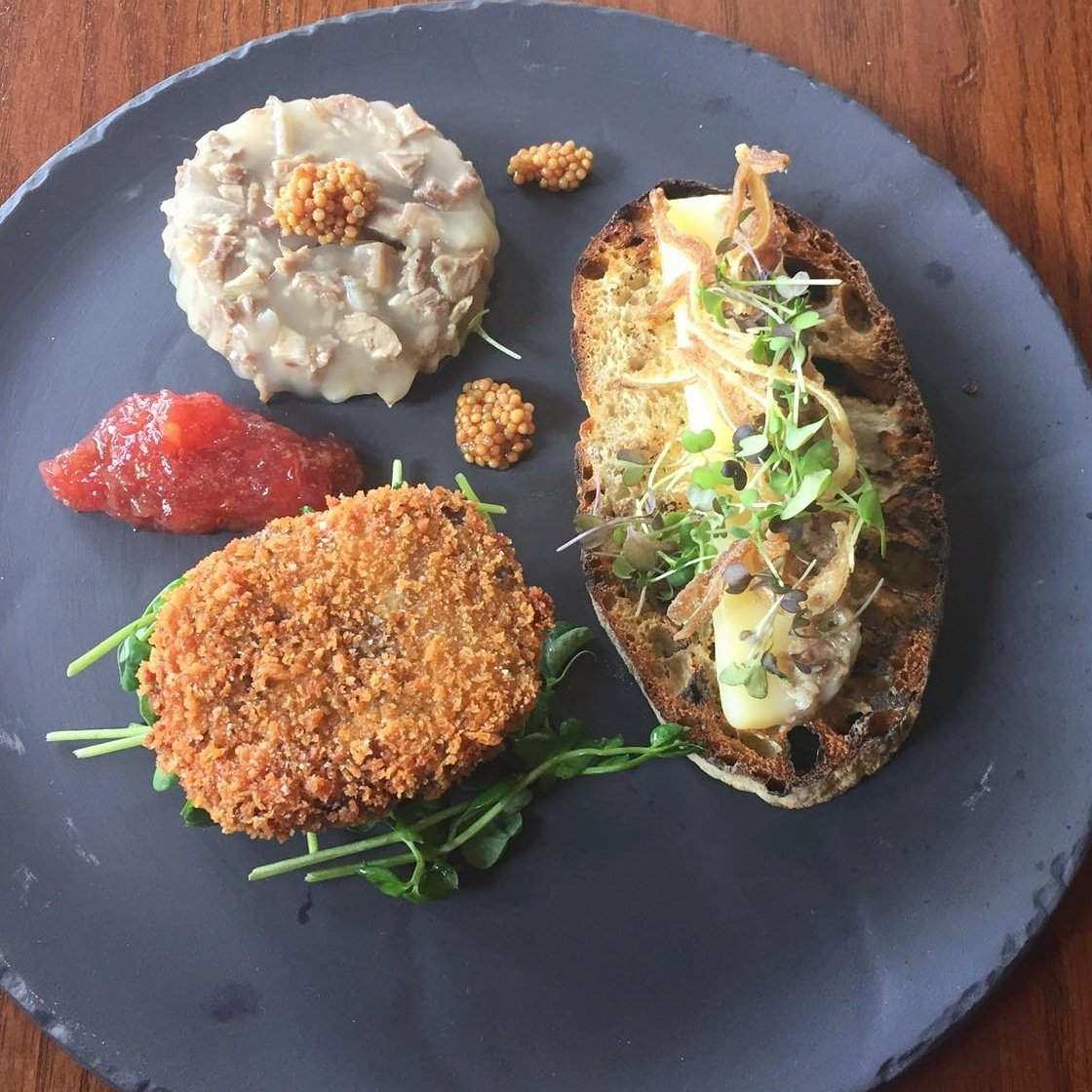 Tonight's Kitchen Feature Pig's Head 3 Ways - 1. Crispy pig cheek fritters, rhubarb and red onion marmalade 2. Head cheese jowl and snout 3. Pork butter & toast, crispy pig earpic.twitter.com/WgKgCnJOAY