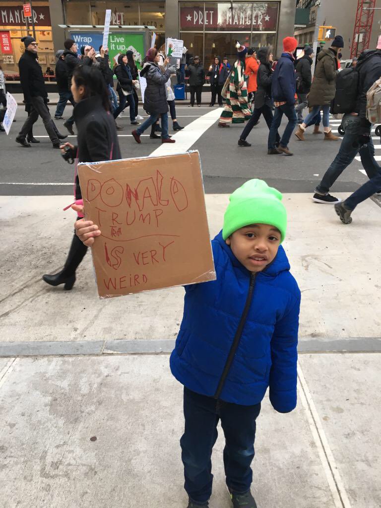 My son gets straight to the point at his very first protest.