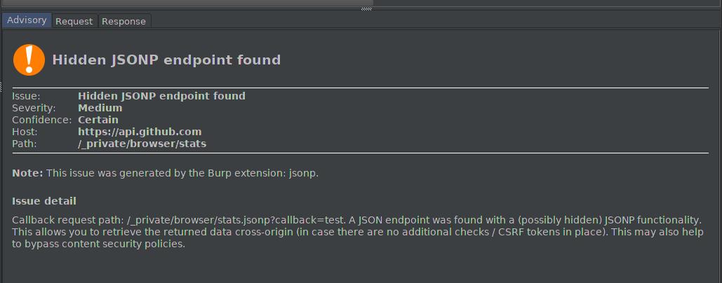 I've become lazy to test endpoints for JSONP functionality, so I decided to create a Burp extension. It attempts to find JSONP functionality behind every request responding with content-type application/json, on the fly. Check it out at https://github.com/kapytein/jsonp !pic.twitter.com/CEvUfEMJqQ