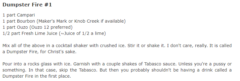 So far the Moscow Mule, Dark and Stormy, and Scotch options are my favorite. Dumpster Fire is close behind.