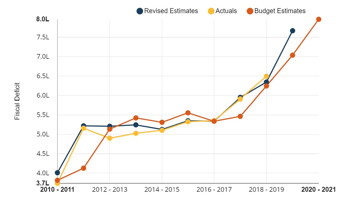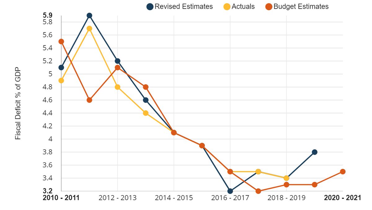 #FiscalDeficit as a % of GDP has been falling in the last decade, from 6.4% in FY10 to 3.5% in FY18. However, it's projected to go up in#Budget2020 amidst relatively flat growth in revenue receipts & increasing govt expenditure. Will this extra spending pay off?#BudgetWithCDLpic.twitter.com/HPyUmL4U6F