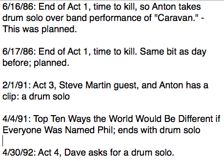 I couldn't find anything that involved a bombed joke, but I made a list of all of Anton's drum solos, attached here.pic.twitter.com/6sQolRtcL4
