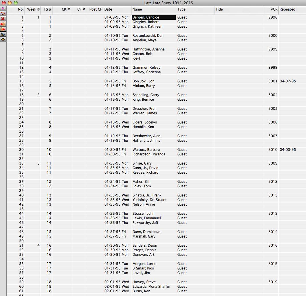 Throughout the Late Late Show/WPI years, I kept a log of all dates and guests: Snyder on paper, Kilborn/Ferguson databased nightly. I'm finally inputting the Snyder years and came across a 1995 interview I just digitized & will upload soon.pic.twitter.com/YRWY0NjXIz