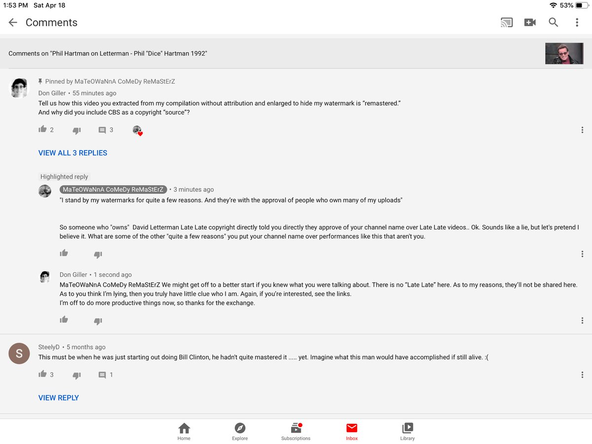 I can’t. I tried before with other copycats. Not my content. He enlarged the video size to hide my watermark, then touted it as “remastered.” The fool also cites this LN clip as “CBS,” so that tells you something.