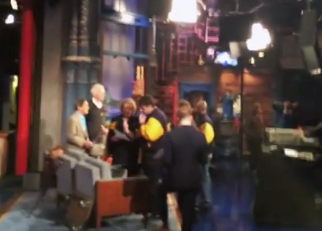 Here's a screen capture of Kenny and Pat behind Dave's desk from video made before the last show's rehearsal by Frank David Greene, the CBS Orchestra's trumpet player.pic.twitter.com/95DlserCJx