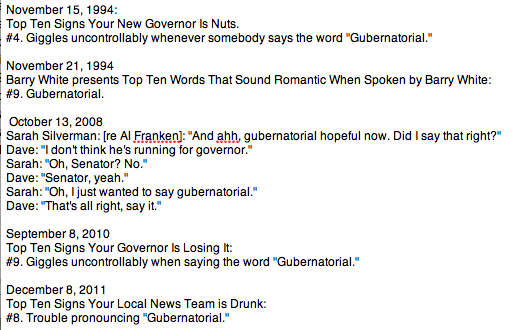 "Gubernatorial": 19 hits in the LS site transcripts. Five mock the word; two Top Tens repeat the same joke, 16 years apart.pic.twitter.com/4DROuJbxhP