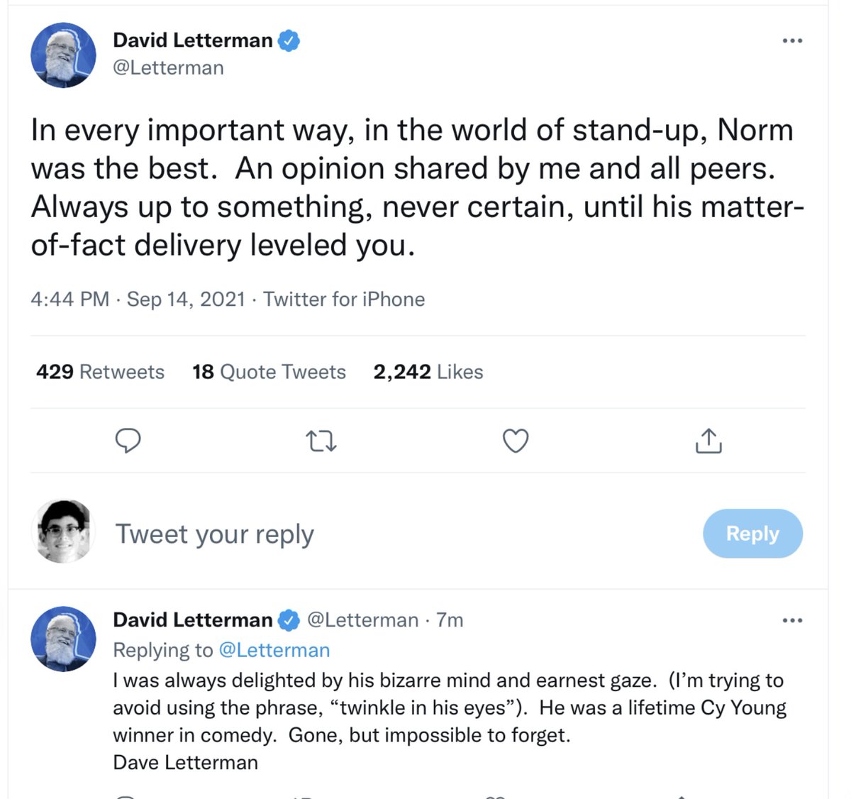 But no matter; just conversing with Norm was a privilege. And after I uploaded all of his Dave appearances in a five-part compilation, he followed me on the Twitter. What a talent. (/end)
